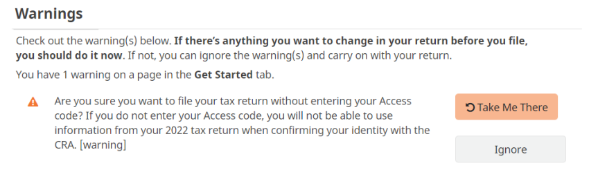 Warnings should be reviewed before you file your return. However, if they don’t apply to you or if you want to ignore them, you can continue to NETFILE without correcting them. Warnings will be highlighted in orange text, on the ERRORS page under the Wrap-Up tab in H&R Block’s DIY tax software.