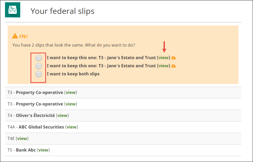 Keep in mind, the software might flag one of your slips as a duplicate when in fact it isn’t one. This can happen if two different slips have identical amounts reported in the same box. While this doesn’t happen too often, you should still look at each slip (click the view link next to each slip) before deciding to keep one or both.
