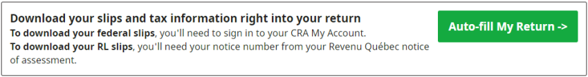 Note: If you have a CRA My Account and want to use the AFR service to download your federal slips into your return, you’ll be given the option to do that here. Refer to the Auto-fill my return (CRA service) section above for more information.