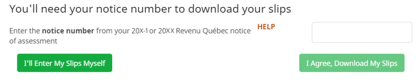 - Enter your most recent Notice of Assessment (NOA) number* and click the I Agree, Download My Slips button to download your RL slips and other tax information into your return.