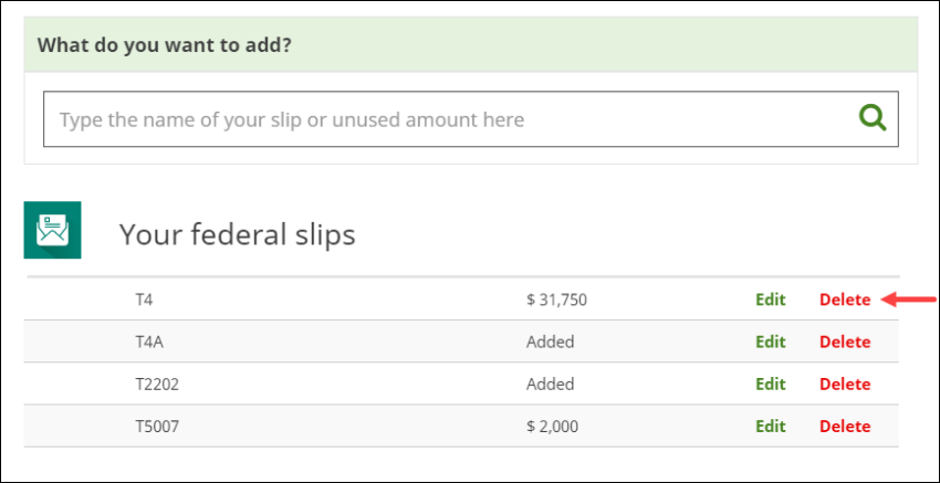 In either case, you’ll need to delete the duplicate or incorrect version of the slip. You can do this by clicking the Delete button next to the slip you’d like to remove from your return on the Smart Search page under the Government slips tab.