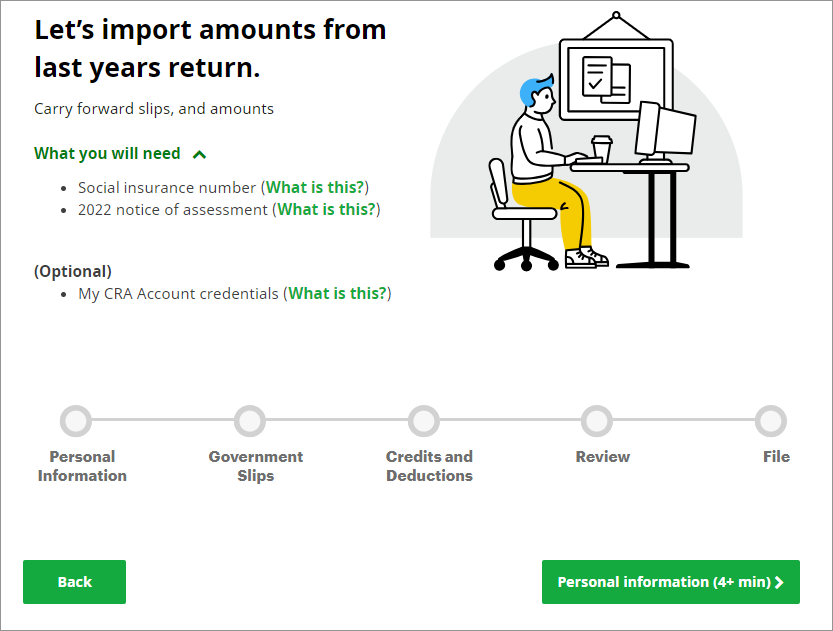 On the Let’s import amounts from last years return page, click Personal information (4+ min).