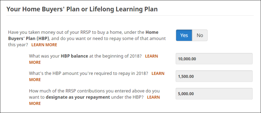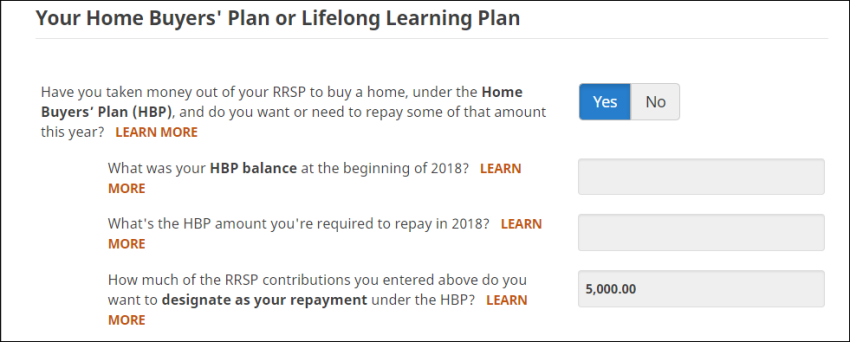- When you arrive at the page for your RRSP contributions and HBP or LLP repayments, under the Your Home Buyer’s Plan or Lifelong Learning Plan heading, answer Yes to the question: Have you taken money out of your RRSP to buy a home, under the Home Buyers’ Plan (HBP), and do you want or need to repay some of that amount this year?