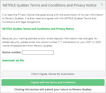 *In H&R Block’s tax software, you’ll be asked to enter your 2022 or 2023 Revenu Québec NOA number in the Notice number field when you NETFILE your Québec return. You’ll see this field if you indicated, on the page, that your mailing address changed during the year. This page can be found by navigating to Get Started on the left navigation menu, then .