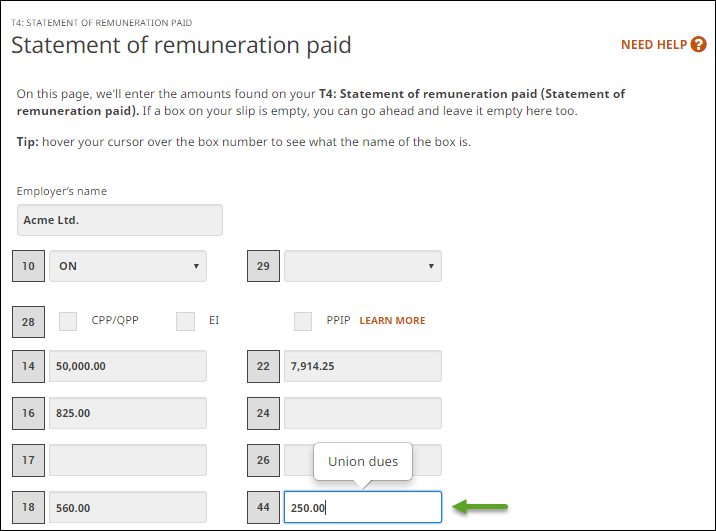 - When you arrive at the page for your T4, enter the amount reported in box 44 of your paper T4 slip into the designated field of H&R Block’s tax software: