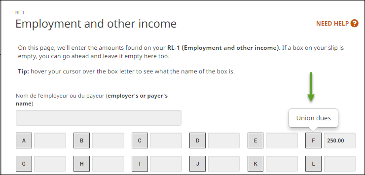 - When you arrive at the RL-1 page, enter the amount reported in box F of your paper RL-1 slip into the designated field of H&R Block’s tax software: