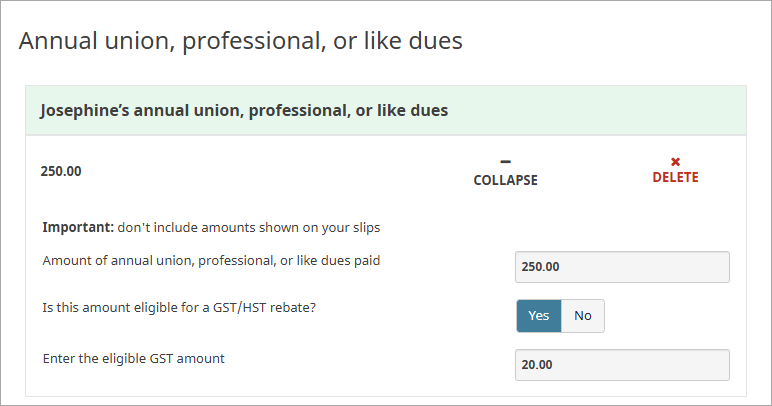 If you paid professional or union dues and your T4 or RL-1 slip doesn’t show the amount you paid, but you received a receipt from the organization to which you paid the dues, you can enter the amount on the Annual union, professional, or like dues page: