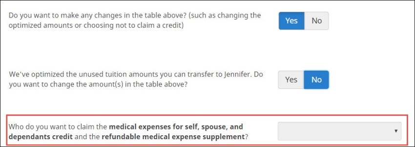 Select Yes in response to the question, Do you want to make any changes in the table above? (such as changing the optimized amounts or choosing not to claim a credit) and then indicate who will claim the medical expenses.
