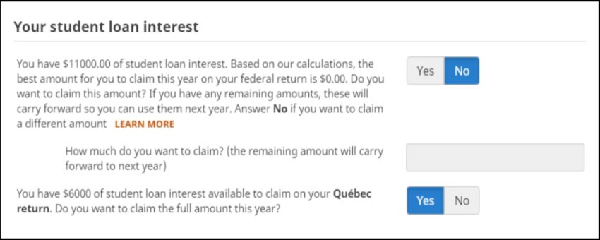 As a Québec resident, you can also choose to claim a different amount for your federal tax credit and your provincial tax credit. If you claim an amount less than the full student loan interest amount, the remainder (your unused student loan interest amount) will be carried forward for you to use in a future year.