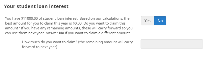 If you claim an amount less than the full student loan interest amount, the remainder (your unused student loan interest amount) will be carried forward for you to use in a future year.