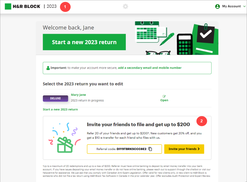 *Terms & Conditions: Up to a maximum of 20 redemptions and up to a max of $200. Referrer must have online banking to deposit by email money transfer into your bank account. If you have issues depositing your email money transfer or do not have online banking, please call 1-800-HRBLOCK for assistance. We just ask that you comply with Canadian Anti-Spam Legislation. Offer valid for new clients only. A new client to H&R Block is someone who did not file a tax return using H&R Block Tax Software in Canada from January 1st, 2024 through December 31st, 2024. Offer excludes Audit Protection and Expert Review.