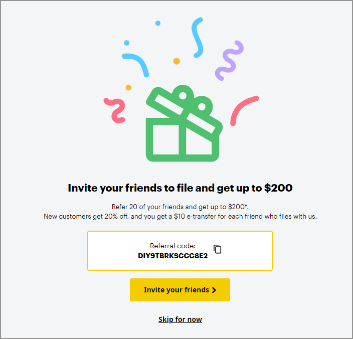 To thank you for filing your taxes with us, we’re giving you a unique code to share with your friends and family*. Each time they use our online tax software to NETFILE their returns, you’ll get $10 and they’ll each get 20% off our DELUXE, PREMIER, or SELF-EMPLOYED package (to a maximum of $200)!