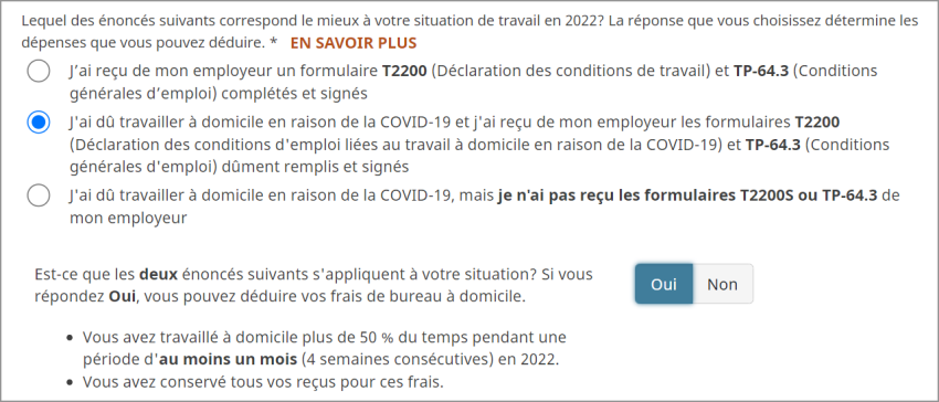 Si vous travaillez habituellement à la maison (pas seulement en raison de la COVID-19) et que vous avez reçu un formulaire T2200 de votre employeur (et un formulaire TP-64.3, si vous résidez au Québec), vous devrez plutôt utiliser le formulaire T777 : État des dépenses d'emploi (et TP-59 : Dépenses d'emploi pour un employé salarié ou un employé à la commission, si vous résidez au Québec).