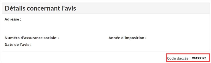 Si vous consultez votre avis de cotisation dans Mon dossier de l'ARC ou à l'aide du service ADC express dans le logiciel d'impôt, votre code est désigné sous le nom de Code d'accès et se trouve sous l'encadré Détails concernant l'avis.