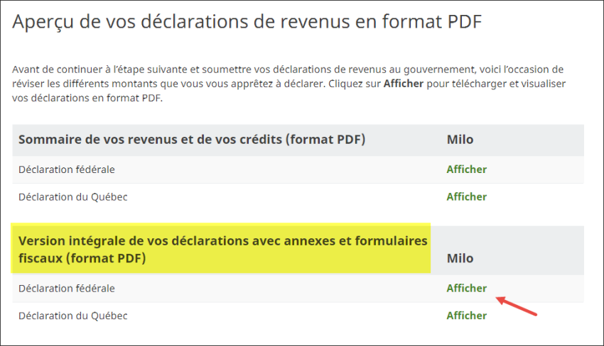 La version détaillée (Version intégrale de vos déclarations avec annexes et formulaires fiscaux (format PDF)) de vos déclarations de revenus affiche, ligne par ligne, les formulaires fédéraux et provinciaux que vous avez remplis; vous pouvez ainsi vous assurer de n'avoir rien oublié avant de soumettre vos déclarations.