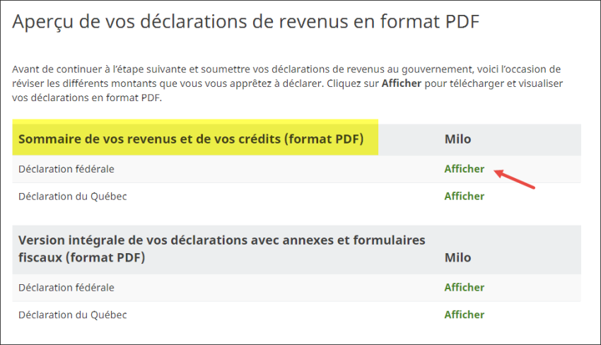 - À la page Sommaire de l'impôt, dans la section Sommarie de vos revenus et de vos crédits (format PDF), cliquez sur le lien Afficher devant la déclaration que vous désirez voir.