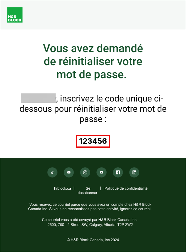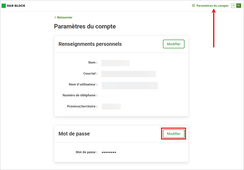Accédez au site Paramètres du compte depuis le logiciel d’impôt ou du service Pro de l’impôt à distance. Dans la section Mot de passe, cliquez sur Modifier. Vous serez déconnecté(e) et invité(e) à vous connecter.
