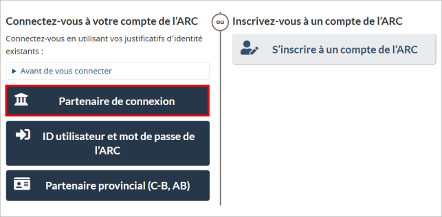 - À la page Mon dossier pour les particuliers de l'ARC, cliquez sur le bouton Partenaire de connexion Ouverture de session/Inscription.