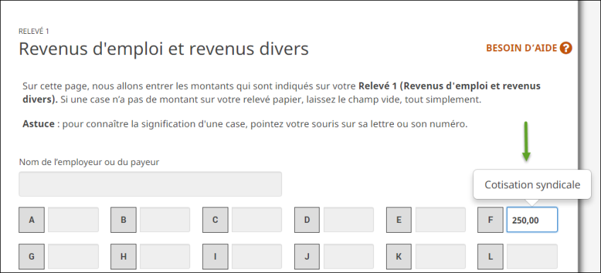 - Lorsque vous serez à la page Relevé 1, entrez le montant figurant à la case F de votre relevé 1 dans le champ prévu à cet effet du logiciel H&R Block :