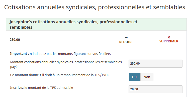 - Lorsque vous serez à la page Cotisations annuelles syndicales, professionnelles et semblables, inscrivez le montant que vous avez payé pour vos cotisations professionnelles ou syndicales comme il s’affiche sur votre reçu.