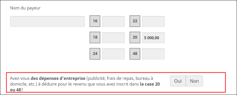 Répondez Oui à la question Avez-vous des dépenses d’entreprise (publicité, frais de repas, bureau à domicile, etc.) à déduire pour le revenu que vous avez inscrit dans la case 20 ou 48?. Vous devrez remplir la page T2125 en plus de la page T4A dans le logiciel d'impôt. Consultez la section J'ai des dépenses d'entreprise à déduire pour mon revenu de travail autonome ci-dessous pour en savoir plus sur la façon de procéder.