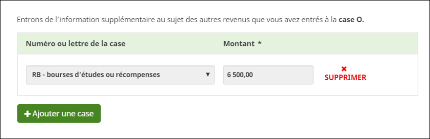 Si vous avez un montant à la case O pour des revenus liés à une bourse d'études, à une bourse de perfectionnement ou à une bourse d'entretien, sélectionnez le code RB dans la zone réservée aux détails concernant la case O.