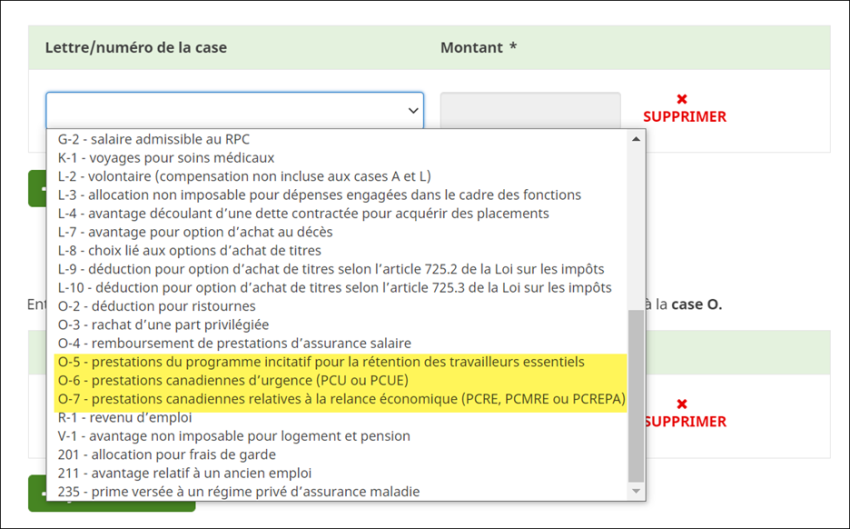 Si vous avez un montant à la case O de votre relevé 1 pour un revenu qui est lié au Programme incitatif pour la rétention des travailleurs essentiels (PIRTE), aux prestations d'urgence du Canada (PCU ou PCUE) ou aux prestations canadiennes relatives à la relance économique (PCRE, PCMRE et PCREPA), sélectionnez le numéro applicable dans la liste déroulante Numéro de la case ou lettre :