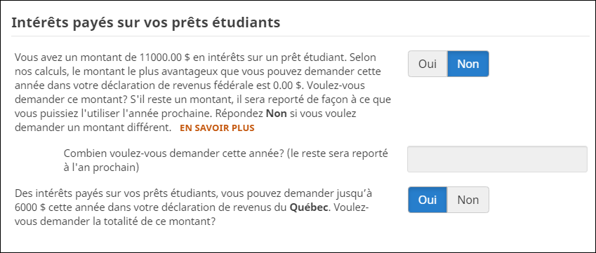 Important : entrez tous les intérêts que vous avez payés dans ce formulaire (les formulaires fédéral et provincial ont été combinés). Vous choisirez le montant que vous voulez demander sous Révision finale de l'onglet Finaliser.